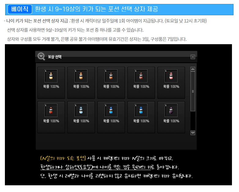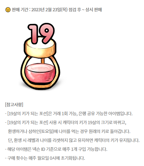 ~살의 키가 되는 포션, 나이 포션 시리즈는 토요일에 캐릭터가 나이를 먹거나 환생해서 새 몸으로 갈아치우게 되면 효과를 다 하기 때문에 꾸준히 사용해야하는 소모재입니다. 지속적으로 특정 키를 유지하려면 최소 1달에 4개, 1년에 52개가 필요한 셈이에요.